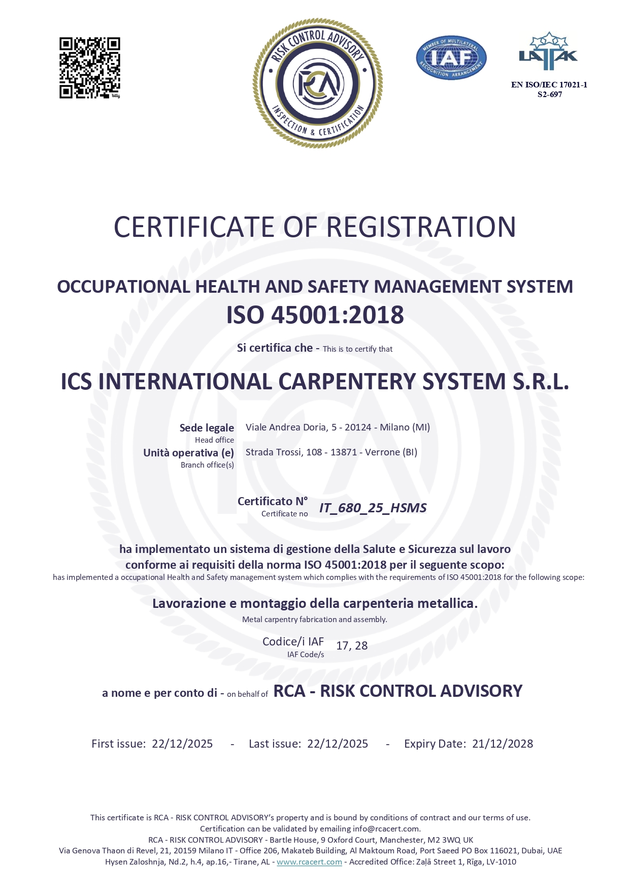 La nostra azienda è certificata secondo la norma ISO 45001:2018 per il Sistema di Gestione della Salute e Sicurezza sul Lavoro, garantendo un ambiente di lavoro sicuro per i nostri collaboratori e partner.
